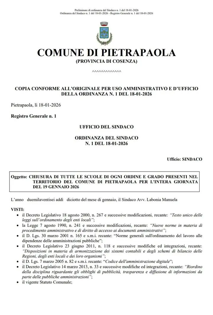 COMUNICAZIONE ALLA CITTADINANZA Si informa la cittadinanza che in data odierna, alle ore 14:00, è stata effettuata la rimozione della tartaruga marina spiaggiata sul litorale di Pietrapaola. L’intervento non è avvenuto in tempi immediati a causa delle necessarie procedure burocratiche e degli adempi