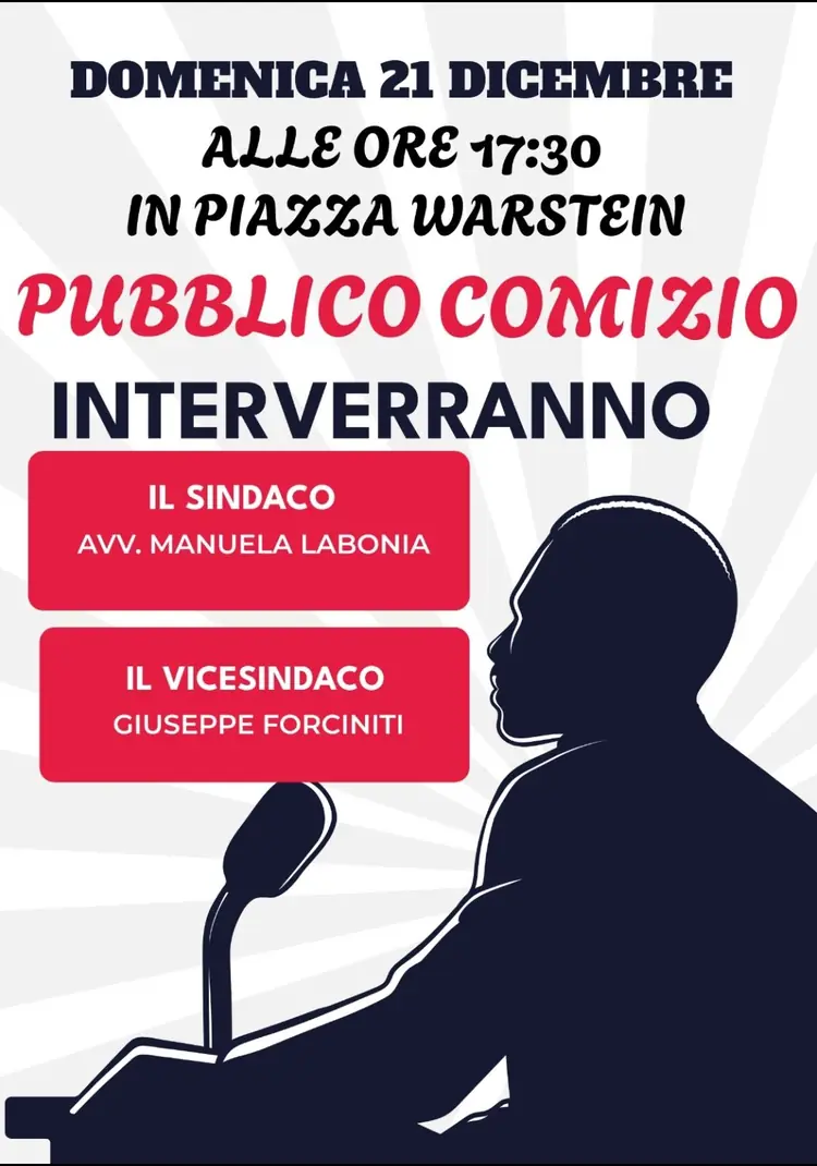 📢 PUBBLICO COMIZIO 🗓 Domenica 21 dicembre 🕠 Ore 17:30 📍 Piazza Warstein Un momento di incontro e confronto aperto a tutta la cittadinanza. 🎤 Interverranno: 👉 Il Sindaco Avv. Manuela Labonia 👉 Il Vicesindaco Giuseppe Forciniti Vi aspettiamo numerosi. La partecipazione di tutti è fondamentale! 🤝 Non m